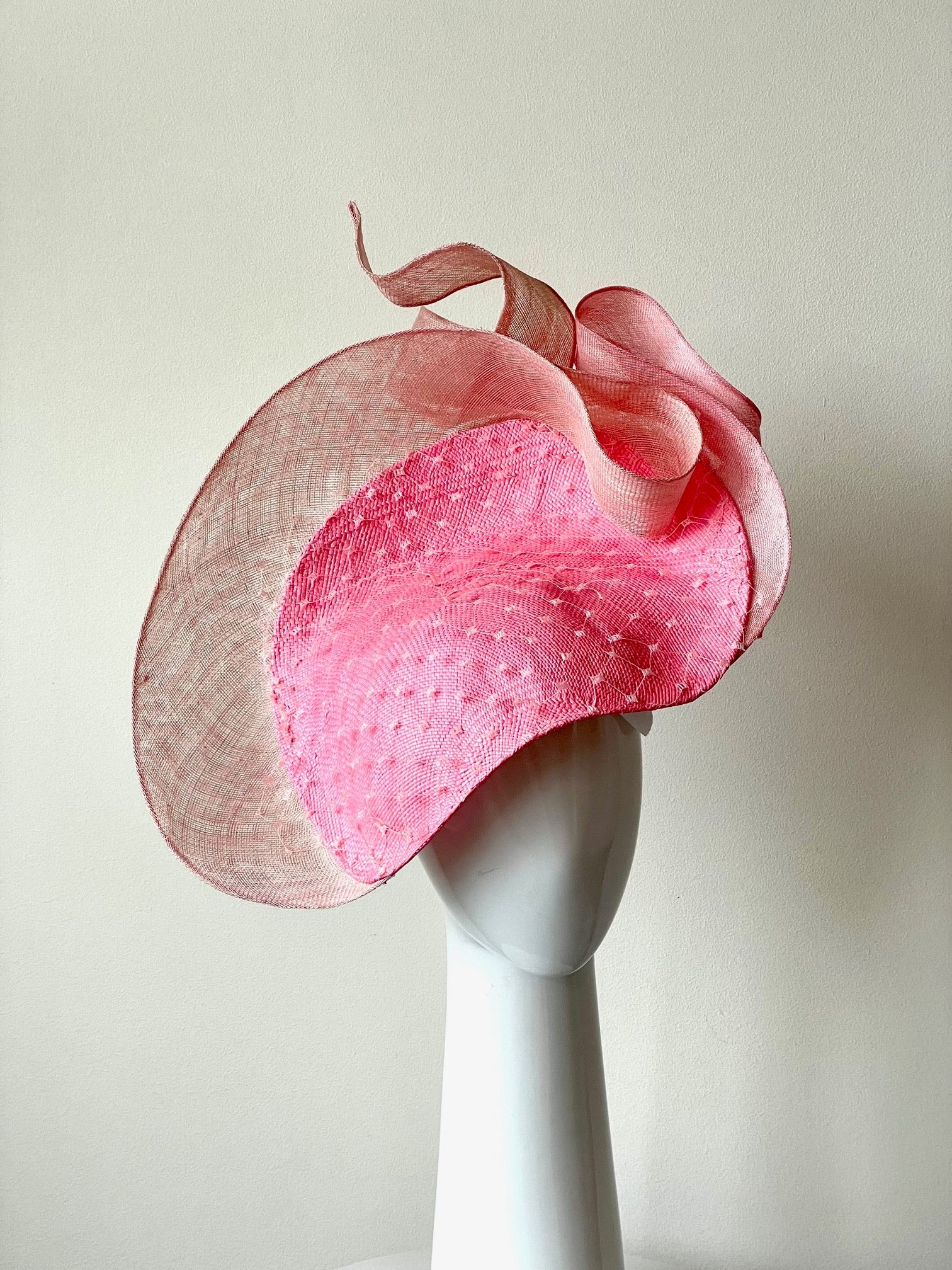 The Platter Hat in Soft Pinks with Waves features an asymmetric and sweeping arched candy pink platter hat brim, overlayed with veiling and a two-tone pale pink softly curved sculptural wave.
