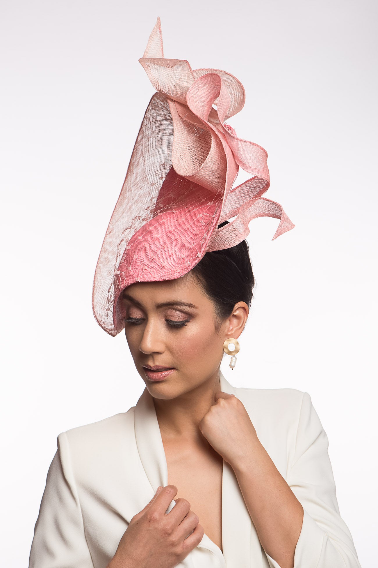 Add elegance and sophistication to your Spring racing outfit with the Platter Hat in Soft Pinks with Waves.