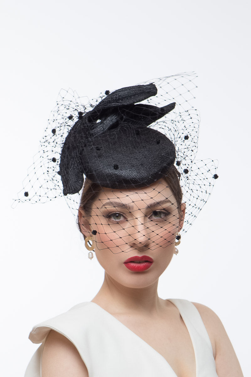 The Black Pleated Bow Veiled Cocktail Hat features a double parisisal pleated bow which curves over a vintage straw covered button hat and draped with vintage spotted veiling. Finished with a gorgeous birdcage veil.