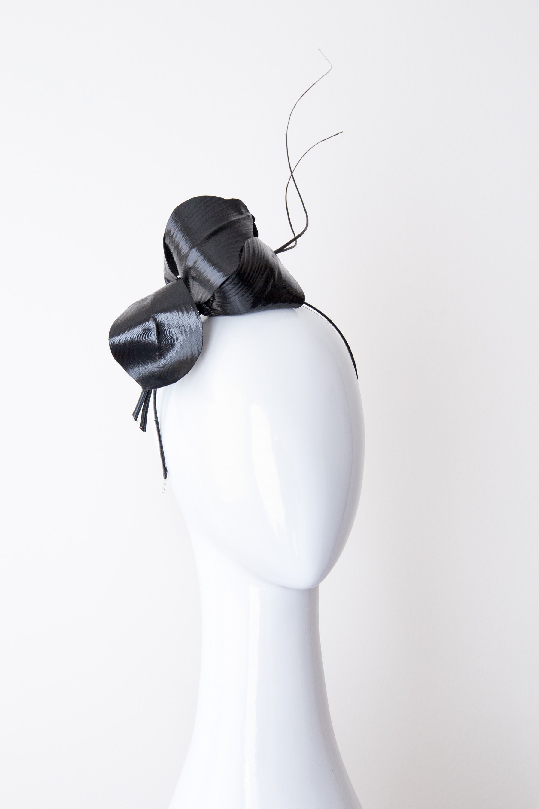 The Floating Tulip Flower Headpiece features black faux patent leather and silk stylised tulip with quills twirling from the center of the flower.