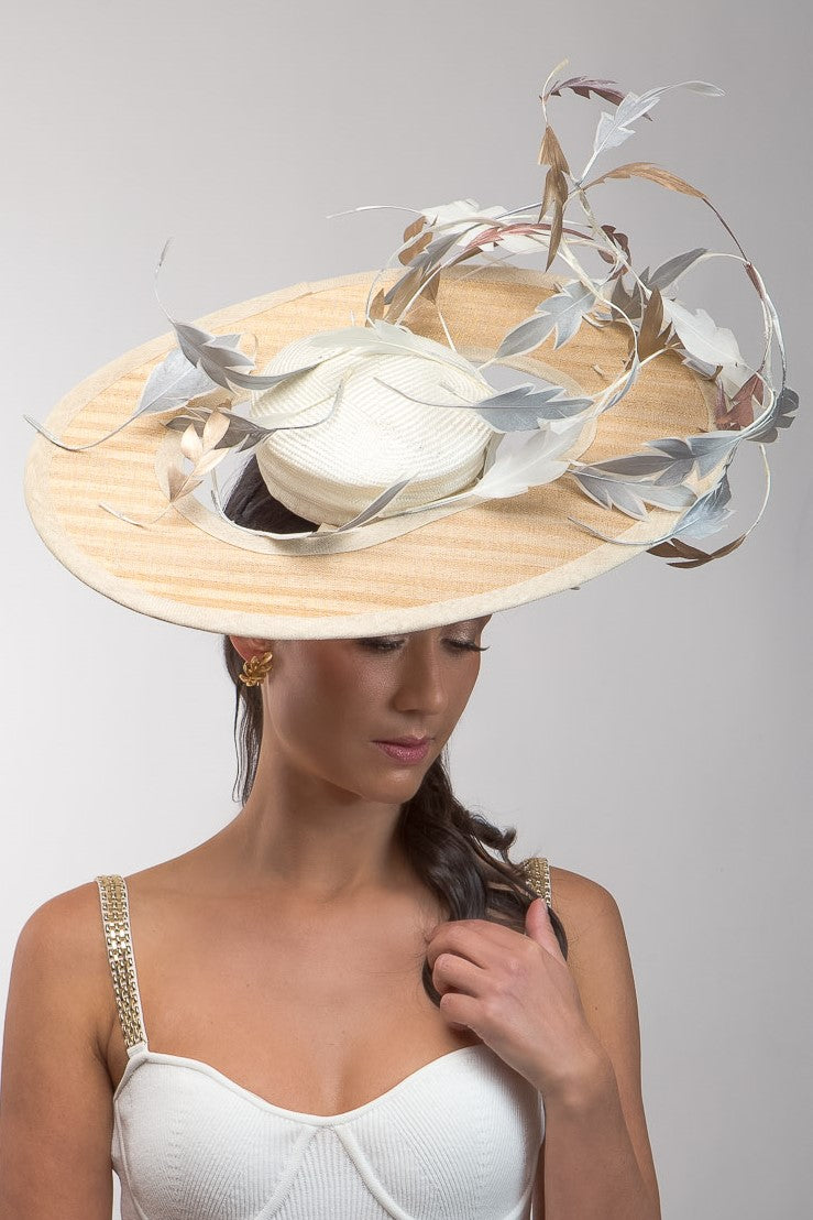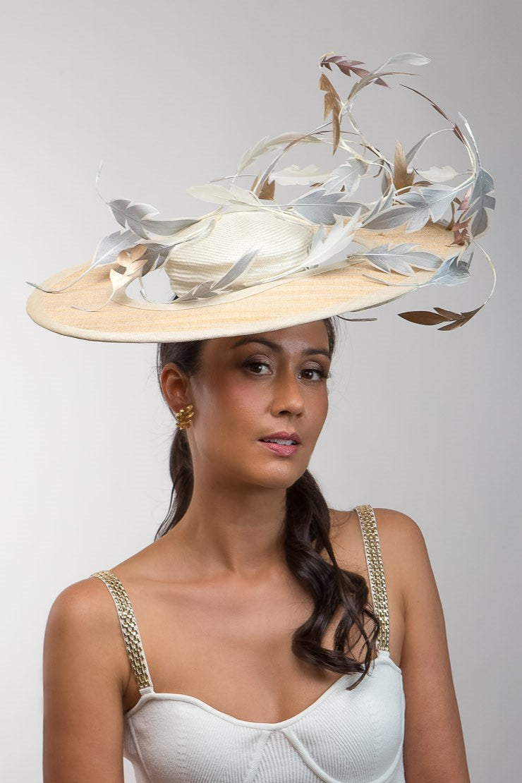 Hand created with parisisal and sinamay straw and hand cut feathers. Gold and Silver sweeping Platter with Dancing Feathers is finished with a comb attachment, and elastic and wireframe for the perfect fit and comfortable all-day wear. One size fits all.