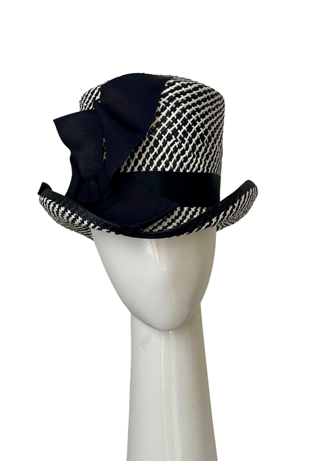 The Monochrome Top Hat is a beautiful curved top hat, with a crown in an open weave white and black straw and teamed with a black edged brim. Trimmed with wide grosgrain ribbon and bow .