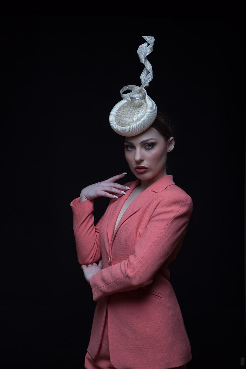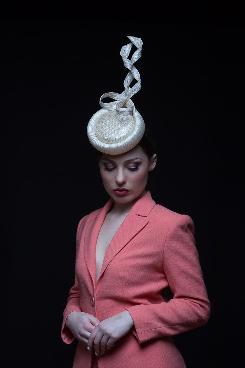 The Silver and Cream Percher Button Hat features swirls which add height and lightness. A button hat in silver fleck is wrapped with cream straw. Finished with delightful swirls in natural and silver which are edged with an ivory braid