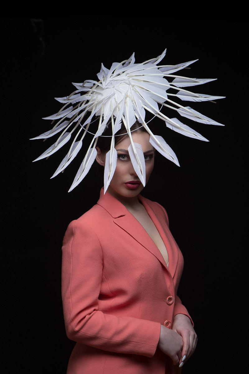This striking bespoke millinery piece would be a standout for any Fashions on the Fields event, from Melbourne Cup to Royal Ascot or the Dubai Cup. A perfect transeasonal hat to wear across all seasons.
