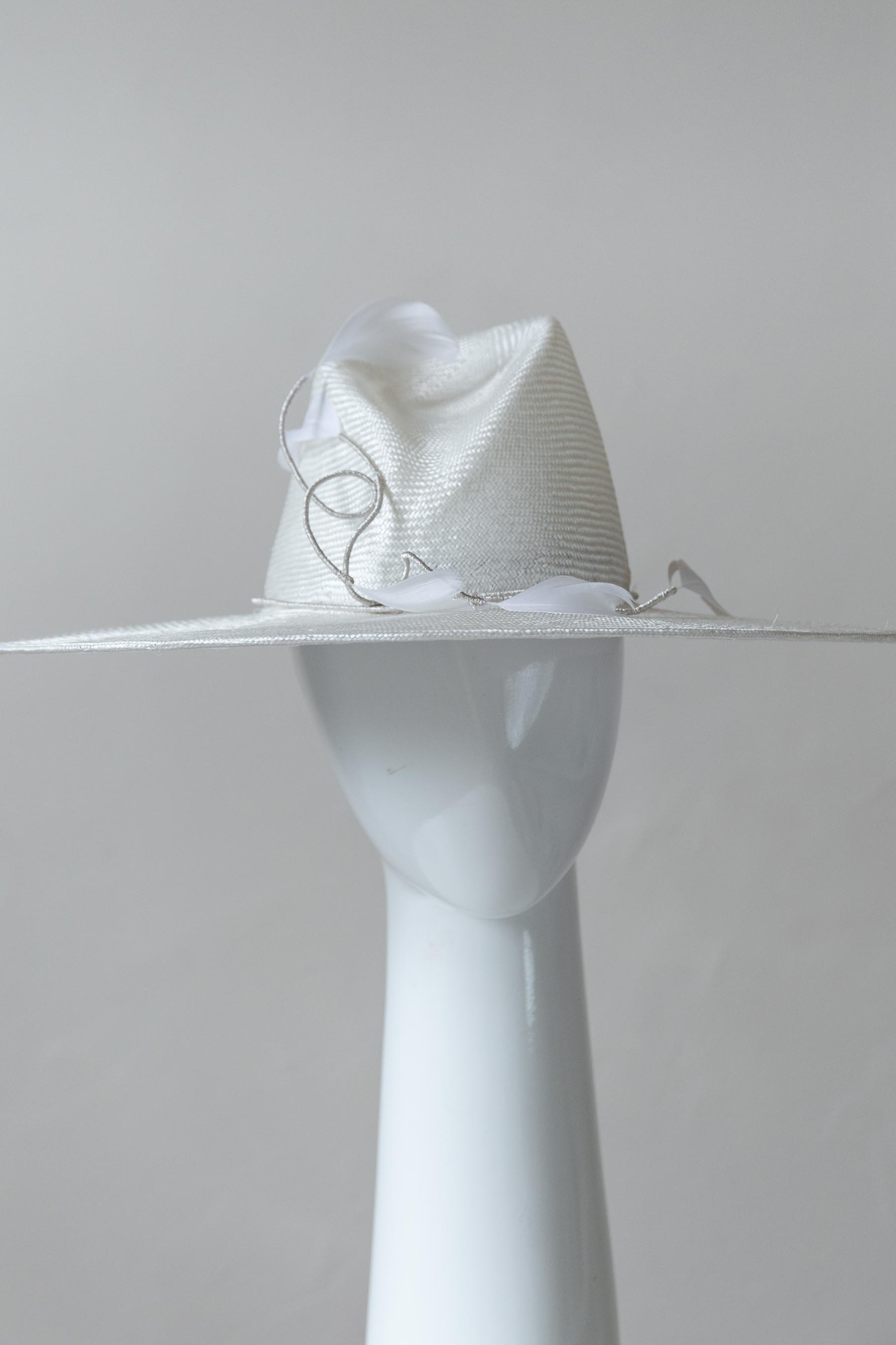 Crafted with attention to detail with silver wired curls and sculptured soft feathers, crafted with attention to detail. The White Concave Fedora with Sweeping Feathers incorporates a light wire in the brim and a double layer of white sinamay on the underside, to ensure it retains its shape.