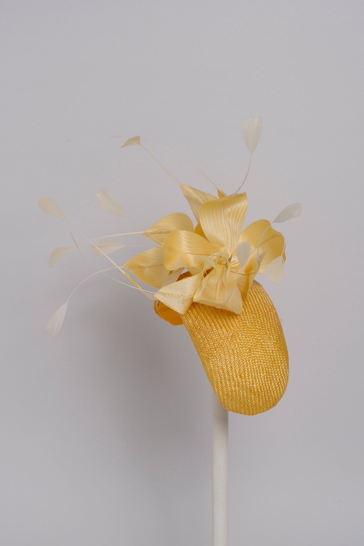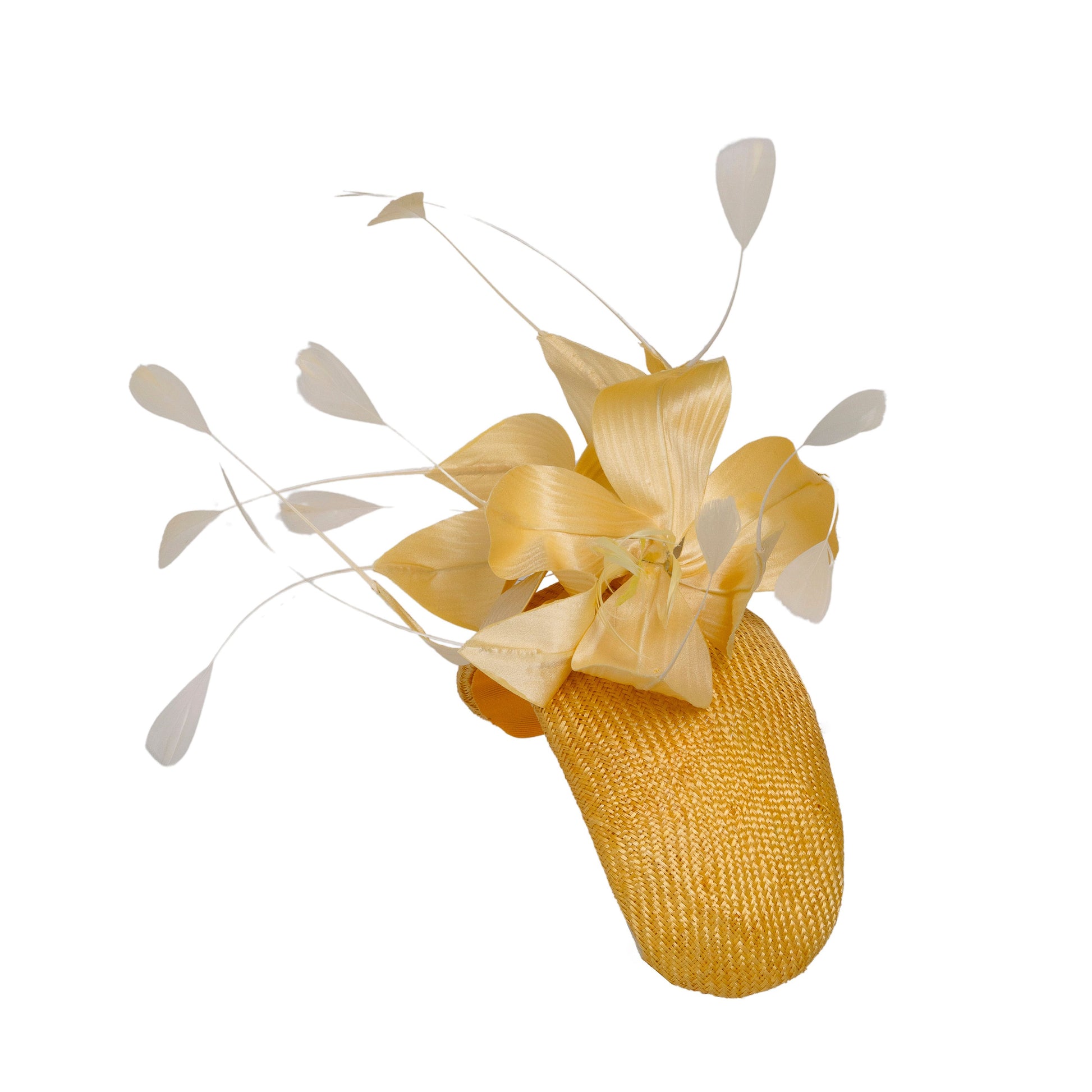 The headband is hand blocked in parisisal straw, and the flowers made in silk with feather highlights.